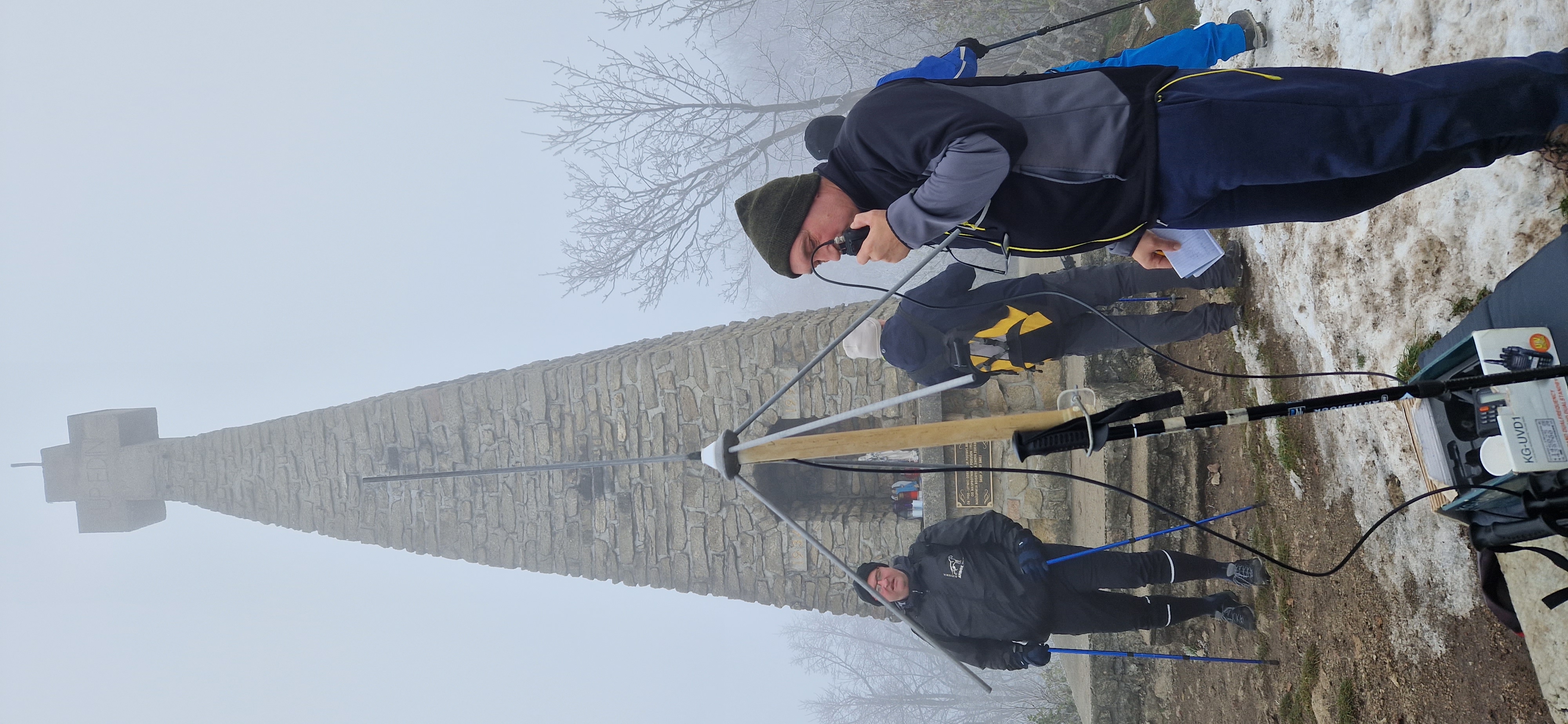 Na parkirišču Rudijevega doma smo so srečali še s preostalimi člani, ki so se sami pripeljali in bili željni druženja in pohoda. Po krajšem pozdravu, popiti kavici smo se opremili in odšli v smeri zamegljenega vrha. Ves čas na poti do vrha, nas je spremljala megla, malo snega, malo ledu in blata, vendar nas to ni oviralo in nam pokvarilo razpoloženja. Ves čas pohoda smo namreč obujali dosedanje pohode in srečanja. V času krajšega pogovora med člani, je naš član Milan Pivk, ki je član našega radioamaterskega krožka, izkoristil postanek tako, da je na vrhu razvil anteno in vzpostavil nekaj kontaktov z oddaljenimi prijatelji preko UKV povezave.
